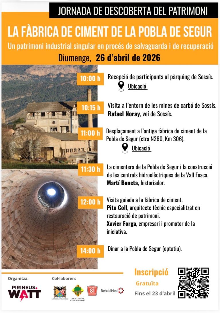 On April 26, around seventy people took part in a guided tour of the cement factory in La Pobla de Segur. Organized by the association for the promotion of hydroelectric heritage Pirineus Watt, with the collaboration of RehabiMed, the visit began in the village of Sossís, where the quarry and coal mines are located that supplied the raw materials and fuel for the production of natural cement at the factory. The tour then continued to the factory in La Pobla de Segur, an industrial building from the early 20th century, constructed by the company Energia Eléctrica de Catalunya, led by Emili Riu, with the aim of producing the cement needed for the construction of the hydroelectric system in the Flamicell Valley. Afterwards, participants visited the lime kiln at Font de l’Ús, near the factory.